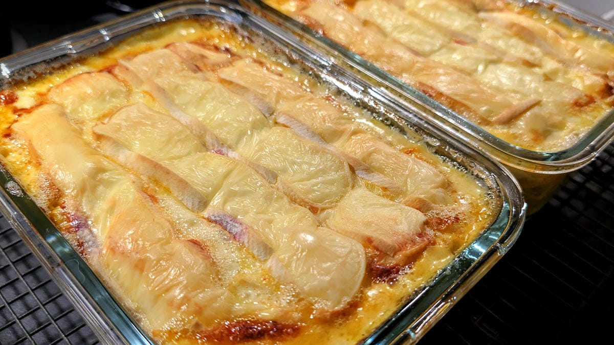 Dans un ou plusieurs plats, répartir la préparation. Couvrir avec les tranches de reblochon et mettre au four 25 minutes à 200°C, en surveillant la cuisson.