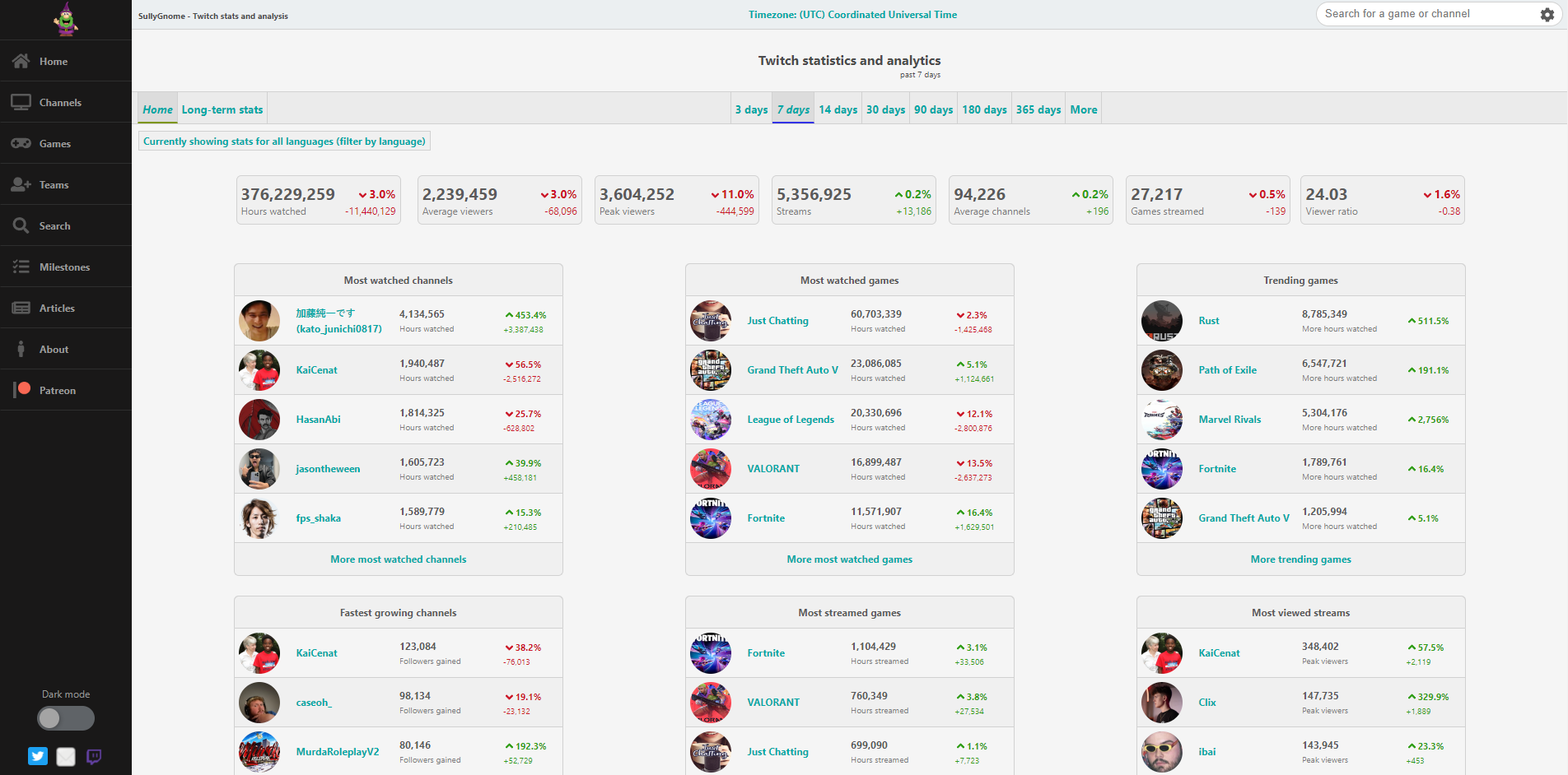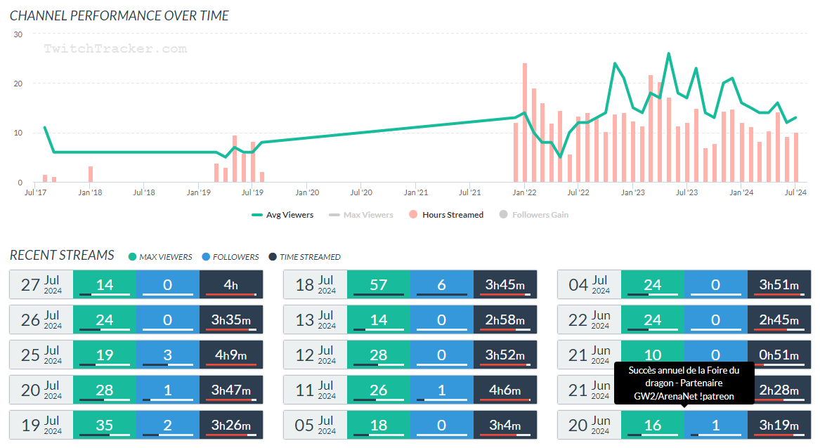 Petite information supplémentaire : SullyGnome recueille les données de Twitch et les agrège toutes les 5 minutes ; les informations sur leur site sont mises à jour de toutes les heures, à tous les jours.