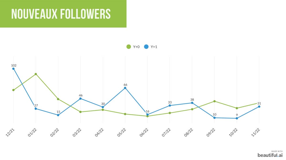 Une à deux fois dans l’année, je me pose pour réunir différentes statistiques et essayer d’en tirer des enseignements. À moins d’avoir des formats très impactant, d’organiser des événements, ce n’est pas nécessaire de faire plus. Vous comparez ainsi un plus grand nombre de chiffres et sur des périodes plus longues. Si votre population est plus importante que la moyenne, un tableau de bord mensuel peut être une bonne idée.