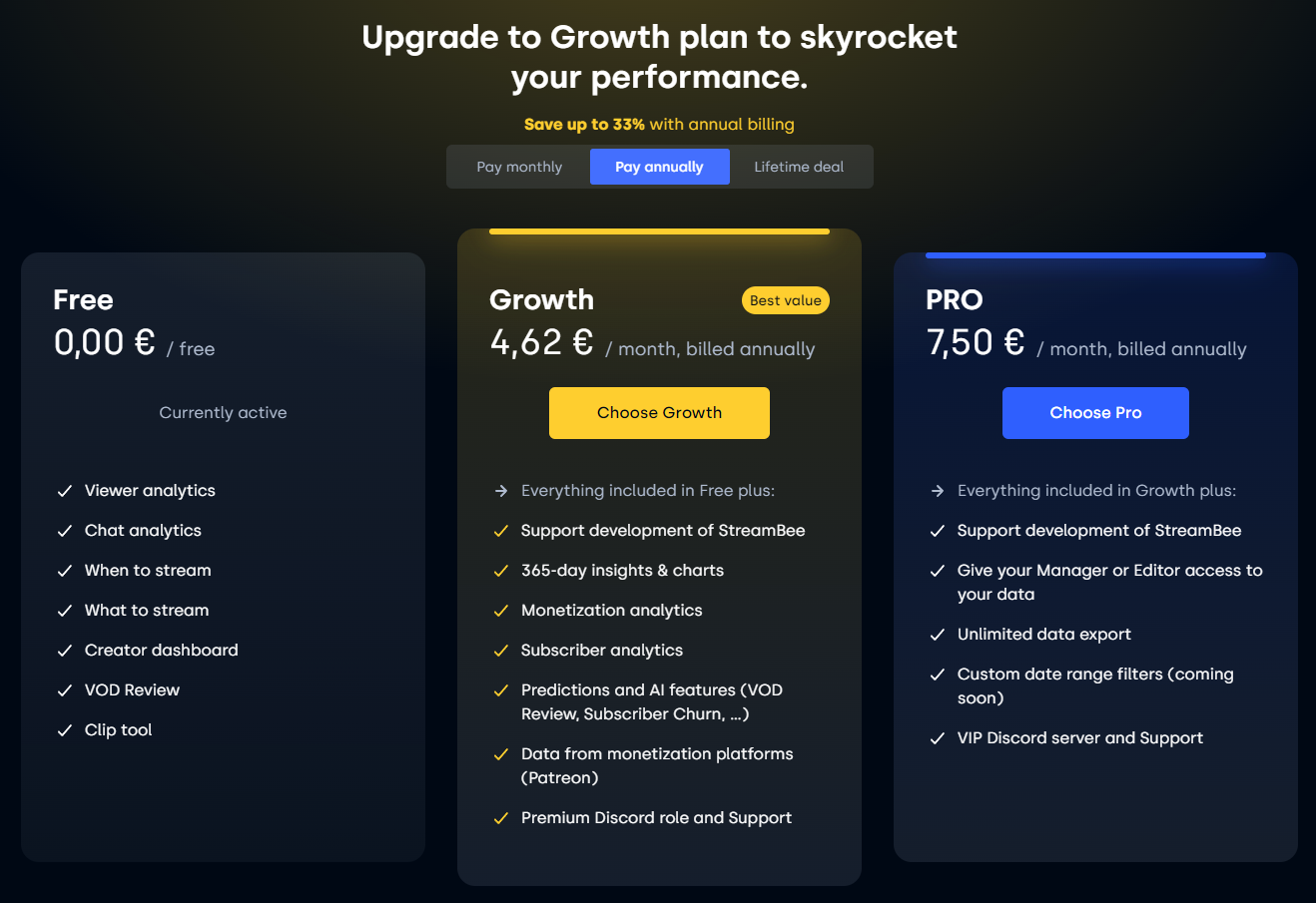 Cette collection précieuse d’outils est gratuite, mais si vous voulez allez plus loin dans l’analyse des caractéristiques de votre chaîne et de vos spectateurs, il existe un tarif premium qui débloque notamment l’accès à l’analyse des abonnements de votre chaîne et du profil de vos abonné-e-s, avec au choix : un paiement mensuel (à partir de 6,59€/mois), annuel (4,62€/mois) ou à vie (179€).