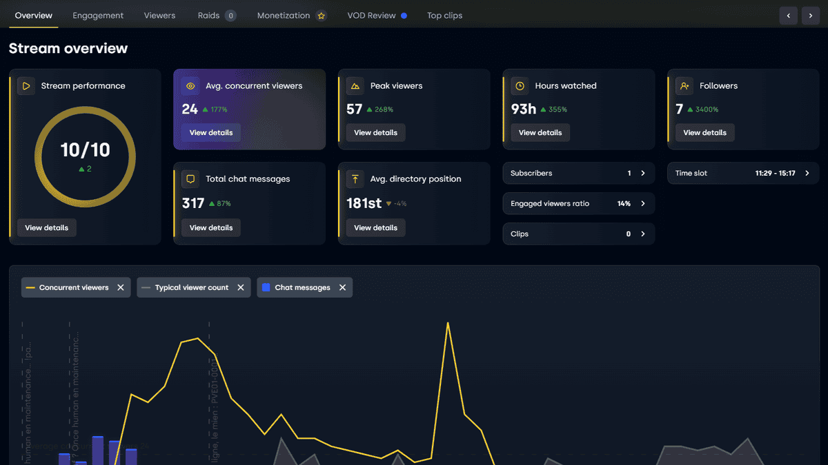 Concernant le système de notation, c’est un indicateur de performance qui tient compte de plusieurs paramètres : interactions des viewers (surtout dans le chat), nombre de viewers, utilisation des points de chaîne, sondages et prédictions ; position sur Twitch dans la catégorie utilisée ; rétention et fidélité. Et cette note est toujours accompagnée d’un mot d’encouragement et de pistes d’améliorations.