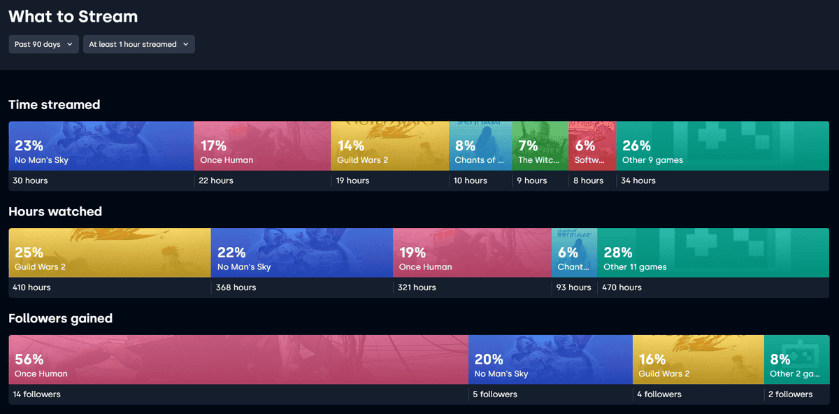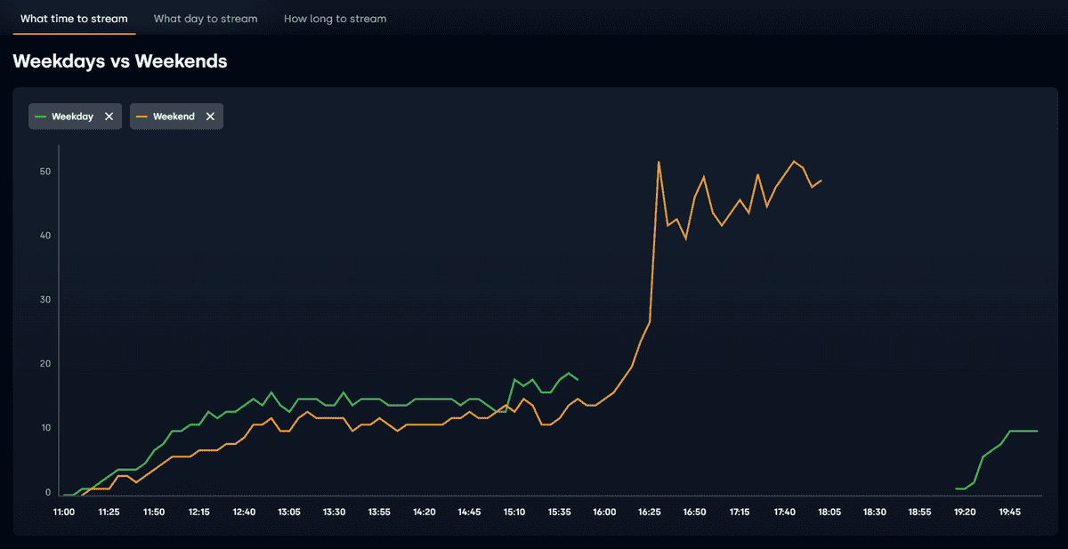 Deux autres rubriques peuvent être intéressantes, à savoir : quoi streamer et quand le faire. Ces informations sont alimentées par vos propres diffusions, donc plutôt à consulter après quelques semaines/mois d’utilisation. Pour le “quoi” : quelles catégories à streamer en fonction de votre moyenne de viewers, des messages dans votre chat, de vos pics de viewers, de votre gain de followers, de votre position sur Twitch… Et pour le “quand” : à quelles heures, quels jours et pour quelles durées.