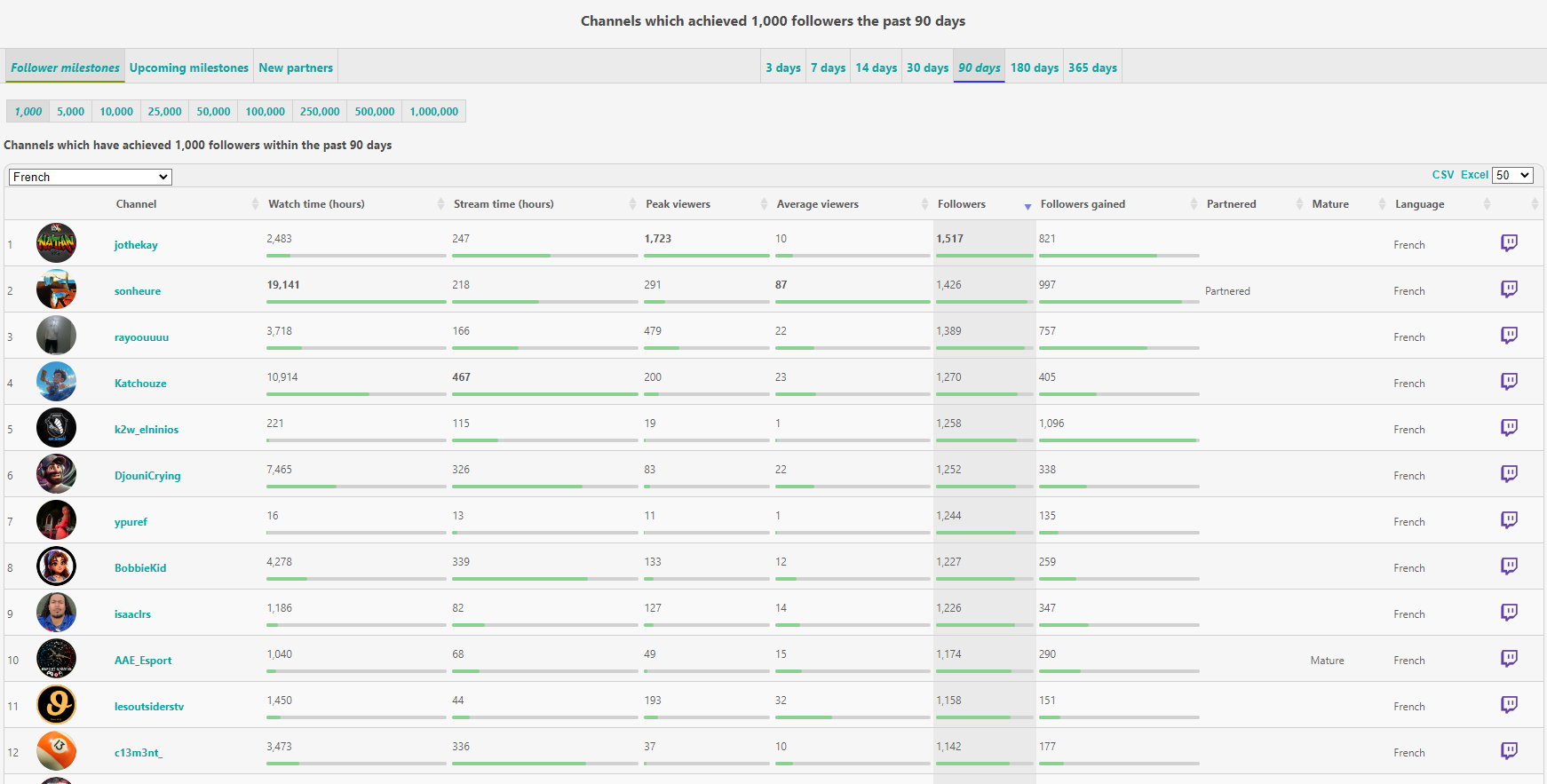 Il y a aussi la rubrique “Milestones” (un jalon, une étape), qui se découpe en 3 sous-rubriques : followers obtenus, nombre de followers proche d’être atteint, et nouveaux partenaires. Pour chacune d’elles, vous pouvez filtrer par langue et sous-objectif (quantité) si applicable, ainsi que la durée. Vous pouvez donc parcourir, par exemple, la liste des (29) français·es qui ont atteint les 1 000 followers ces 90 derniers jours, ou encore le nombre des (113) nouvelles et nouveaux partenaires français·es sur les 90 derniers jours.