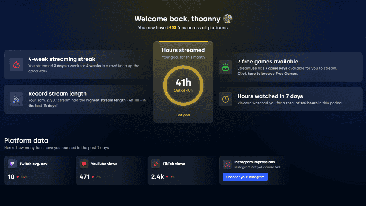 Peut-être que vous n’aurez pas accès à beaucoup de statistiques au début, le temps que StreamBee récupère les informations, et vous n’aurez sûrement pas accès à l’historique de vos streams qui ont été diffusés avant de rejoindre cette plateforme (la partie la plus intéressante).