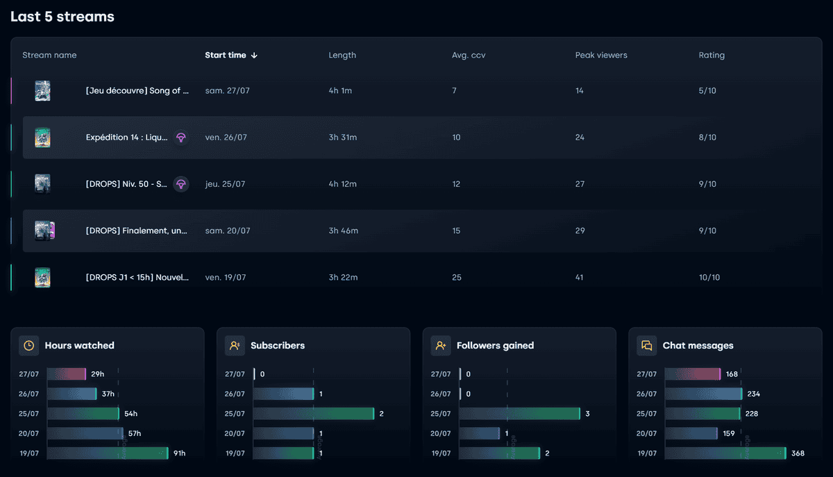 Plus bas, sur votre tableau de bord, un tableau récapitulatif de vos 5 dernières diffusions avec la note associée, puis un comparatif de 4 statistiques différentes sur ces mêmes 5 dernières diffusions : nombre d’heures regardées, abonnés, followers gagnés et messages dans le chat.